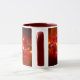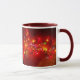 Luzes de Natal de cor suave brilham contra um chão de madeira nesta caneca festiva sazonal.