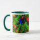 Luzes brilhantes brilham contra os ramos de uma árvore de Natal nesta caneca festiva sazonal.