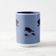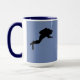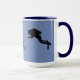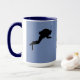 Mergulhadores e tartarugas na silhueta. Imagens negras de dois mergulhadores e três tartarugas num fundo azul médio.
