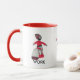 Relaxe pelos feriados. O centro/frente da caneca tem o texto "Tome tempo para relaxar no Feriado". Um lado mostra um elfo trabalhando com um saco de brinquedos. O verso mostra Papais noeis em T-shirt, shorts e óculos Sun.