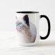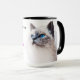 This mug shows a beautiful and aristocratic, yet critically looking cat with elegant white fur and royal-looking blue eyes, who is probably viewing her owner with skepticism.