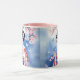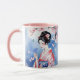 Mug em um retrato de uma bela mulher vestida de um quimono tradicional guarda delicadamente uma borboleta azul em meio a florescentes flores de cereja.