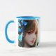 Arte Ai representando uma linda mulher com borboletas azuis no cabelo. Caneca de café personalizada.