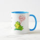 Uma caneca branca de boa qualidade, com um cabo azul de médio e jante, lavadora de louça e segura para micro-ondas. Um sapo está sugerindo que se o receptor for seu Namorados, ele se tornará um Príncipe. Veja também o cartão de saudação e a camiseta.