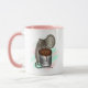 Rato engraçado de desenho animado com uma lata aberta de feijão assado. O outro lado da caneca tem um trocadilho, "Eu não dou um rato."
