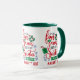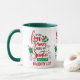 Aqui está uma linda caneca de café Holiday que declara "É tudo divertido e JOGOS até que os PAPAIS NOEIS verifiquem a LISTA DOS NAUGHTY". As cores predominantes são vermelho, verde, azul e preto. A imagem e o texto são repetidos três vezes ao redor da caneca.