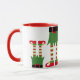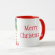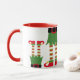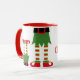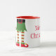 A caneca de café cerâmica é mostrada com um festivo impressão de arte de Natal Elf com Feliz Natal em texto. Personalize este item ou comprar como está.