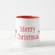 Café/chá/caneca de cacau cerâmico é mostrado com um festivo impressão de arte de Natal com "Feliz Natal" no texto. Impressão de boneco de neve nos dois lados da caneca. Personalize este item ou comprar como está.