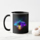 Voz mecânica, antiga, com lâmpada e asas finas brilha cor de laranja, roxo, turquesa sobre fundo preto. Estilo Steampunk.
