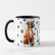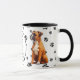 Um adorável Cachorro Boxer fica em dois lados desta caneca. O texto entre as duas imagens diz: "No oitavo dia, Deus criou o CACHORRO BOXER e o chamou de MUITO BOM". As imagens do cão e o banner branco oval que contém os campos de texto são colocados sobre um fundo branco com impressões de pata preta.