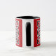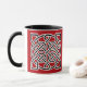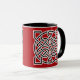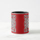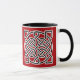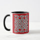 Uma caneca de café em padrão celta tradicional baseada no nó de um marinheiro, feita de duas cordas interligadas que simbolizam a mistura de vidas individuais em uma só. O padrão preto é apresentado em branco sobre um fundo vermelho chinês profundo