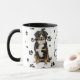 Um lindo Cão da Montanha Bernese olha para você de dois lados desta caneca. O texto entre as duas imagens diz "No dia 8, Deus criou o Cachorro da Montanha Bernesa e o chamou de MUITO BOM". As imagens do cão e o banner branco oval que contém os campos de texto são colocados sobre um fundo branco com impressões de pata preta.