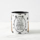 Um lindo Cachorro Malinois belga olha para você de dois lados desta caneca. O texto entre as duas imagens diz: "No oitavo dia, Deus criou a BELGA MALINOIS e a chamou de MUITO BOA". As imagens do cão e o banner branco oval que contém os campos de texto são colocados sobre um fundo branco com impressões de pata preta.