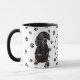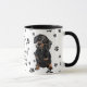 Um adorável cão preto e bronzeado Dachshund parece inquisitivo em dois lados desta caneca. O texto entre as duas imagens diz "No dia 8, Deus criou o DACHSHUND e o chamou MUITO BOM". As imagens do cão e o banner branco oval que contém os campos de texto são colocados sobre um fundo branco com impressões de pata preta. Bonita!