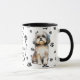 Um lindo Cachorro Shih Tzu fica em dois lados desta caneca. O texto entre as duas imagens diz: "No oitavo dia, Deus criou o SHIH TZU DOG e o chamou de MUITO BOM". As imagens do cão e o banner branco oval que contém os campos de texto são colocados sobre um fundo branco com impressões de pata preta.