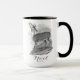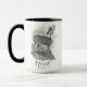 A black & white Christmas/Winter holiday mug with a beautiful antique etching of an exquisite deer accented with 'Noel'.