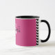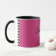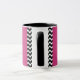 Uma caneca de cor magenta de tom escuro com um padrão de onda um dentro preto completo com o seu monograma personalizado no centro, basta preencher os modelos e escolher o estilo e a cor do dentro.