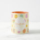 Adicione um toque personalizado às comemorações da Páscoa com esta charmosa caneca! Apresentando um nome personalizável em um grande ovo transparente, este design apresenta um delicioso padrão de guache de cor d'água desenhado à mão de ovos pastel Páscoa em amarelo, verde, rosa e azul. Cada ovo é decorado brincalhosamente com bolinhas, ziguezags, linhas diagonais, coelhos, pintinhos e cenouras, trazendo um sentimento caprichoso e festivo. Colocada contra um fundo amarelo-creme macio, esta caneca é perfeita para as manhãs de Páscoa, reuniões de primavera, ou como um presente de feriado atencioso!