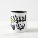 This non-binary pride gaymer mug is for enby players who exist outside the boxes and game outside the expectations — fuelling every session with pride and caffeine. A tiger paw grips a non-binary pride flag controller in yellow, white, purple and black from above with "Level" and "Up!" in bold script — raw enby gaming energy wrapped around a premium ceramic mug that refuses to be ignored.
