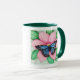 Caneca personalizável com design de borboleta azul feita em lápis de policor e grafite e um verso inspirador.