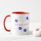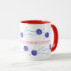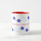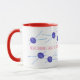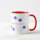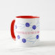Esta caneca diz "Nunca subestime o poder de uma mulher com habilidades de tricô". É decorado com bolas de fio azul e agulhas de tricô. Este é um presente divertido para quem adora tricô, crochê, artesanatos de fios, artesanato ou crio.