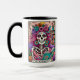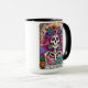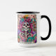 Design vibrante e colorido com um cartão de tarô engraçado com um esqueleto feminino. O esqueleto tem cabelos cor-de-rosa silvestres com flores, uma face de crânio de açúcar, e está segurando um livro aberto. O texto colorido diz: "O worm". Esse design está disponível em uma grande variedade de produtos.