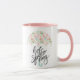 A caneca sazonal bonito tem um guarda-chuva floral colorido com o texto "Hello Primavera" no script moderno