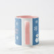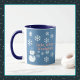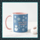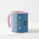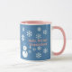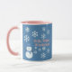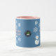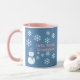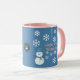 Uma fatia de Vida e Delight apresenta Hello, Winter Wonderland combo canecas de café com um boneco de neve decorado com flocos de neve brancos, escrevendo rosa e um pano de fundo azul. As canecas de café do boneco de neve também têm um chapéu azul e cachecol.