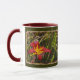 Uma fotografia de um lírio do dia vermelho e amarelo, com gotas de água nas pétalas e folhas.