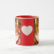 Striped cat on mug with red trim. White heart in center on red background.Art by Patricia Villa.