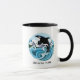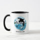 Uma orca pulando do oceano com água por toda parte. Montanhas e céu azul ao redor da baleia assassina desenhadas num estilo de tatuagem art nouveau.