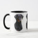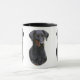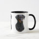 Um Pinscher preto de Dobermann com as orelhas naturais (uncropped) headstudy em uma caneca.