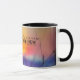 Uma caneca de café com aspas inspiradoras retrata uma bela pintura aquosa com um simples nascer de laranja e amarelo sobre um campo azul nebuloso. Ele apresenta lamentações Bíblias Versos 3:23, "Seus compaixões são novos toda manhã."