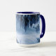 Esta foto foi tirada do ar e mostra os esquiadores a caminho da montanha. As árvores alinham a descida do caminho. O dia estava brilhante e ensolarado. Esta foto está disponível em canecas cortadas.