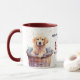 "Ouro Retriever beijos de cachorros consertam tudo" declara esta caneca para o dono do Ouro Retriever Dog. A imagem em cada lado é um retrato de um filhote de Ouro adorável em uma cesta mais perversa. As imagens e o texto são colocados sobre um fundo branco que é aspergido com um confete dourado.