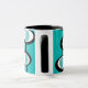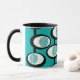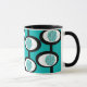 Esta caneca tem um design moderno século Médio de linhas, círculos fazeres, ovais dentro unidos em turquesa, preto e branco.