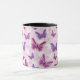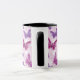 Um padrão perfeito de borboletas voadoras em tons de pinks e roxos com flores brancas sobre fundo rosa claro. © e ® Bigstock® - Todos os direitos reservados.