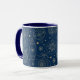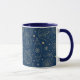 Folha de ouro festiva, decorativa, festiva, desenhada à mão, esferas de árvores de Natal, decoração, flocos de neve e padrão de estrelas sobre fundo azul-escuro de aquarela.