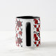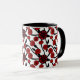 Flores vermelhas, pretas e brancas, caneca de café com padrão de película branca.