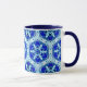 Caneca de café com padrão geométrico de colmeia em flocos de neve em azul e branco de cobalto profundo, acentuado com turquesa
