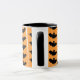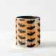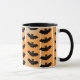 Uma caneca de café para o Dia das Bruxas com a minha design de morcegos negros voadores num fundo laranja e branco.
