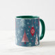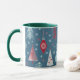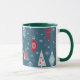 Padrão do Natal de inverno. Vermelhas estilizadas, árvores de Natal verdes, bolas de Natal em fundo azul.