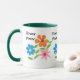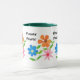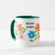 Uma caneca de café branca e chique com lábio e punho verdes, decorada com motivos florais brilhantemente coloridos, de uma colagem de papel pintada à mão por Judy Adamson.