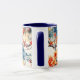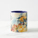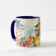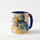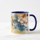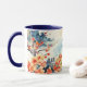 Linda caneca com uma paisagem asiática com pagode em segundo plano. Matizes de marinho, azuis, laranja, amarelas em aquarela macia.