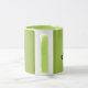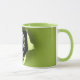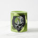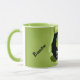 Uma caneca de cerâmica verde, com gráficos de um furo rasgado, no meio, e um palhaço preto e branco assustador se espiando. Personalize o texto preto para atender às suas necessidades.