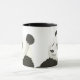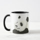 Caneca branca com dois Pandas em volta da área da imagem. O fundo é branco e a xícara é dentro preto, com uma alça preta. O Panda está pintado.
