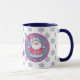 Aqui está uma linda caneca de Natal personalizada que crianças e adultos podem apreciar. Um lado apresenta uma adorável imagem nórdica de renas no centro de um fundo de cinza azul que é enquadrado em cor-de-rosa lavanda. O outro lado tem Papai Noel na mesma faixa circular. As imagens emolduradas são colocadas sobre um fundo correspondente de floco de neve azul e branco, com seu texto personalizado em azul marinho entre as imagens.