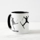 Esta caneca de café está pronta para ser personalizada com um nome, uma mensagem personalizada ou o seu ponto de esqui favorito. Ele apresenta gráficos estilo silhueta em preto de três esquiadores executando truques de esqui.