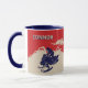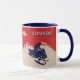 Crie um presente personalizado para o seu moto de neve favorito. Eles vão adorar o aquecimento com café quente ou chocolate quente depois de um dia de neve movendo-se nesta caneca personalizada. Ele tem uma ilustração de estilo vintage de um movente de neve e cavaleiro em um conjunto azul marinho contra um pano de fundo de creme ou montanhas coloridas de marfim contra um fundo vermelho. Está pronto para ser personalizado com um nome no creme e em letras azuis. O gráfico envolve a caneca com o nome que aparece em ambos os lados.