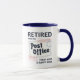 Uma caneca de café de dois tons para seu colega de trabalho ou chefe que se aposentará após muitos anos de excelente serviço. A design é moderna e a redação diz: "Aposentado do Gabinete de Posto. Cada hora é a hora feliz" Faz um presente perfeito de festa
